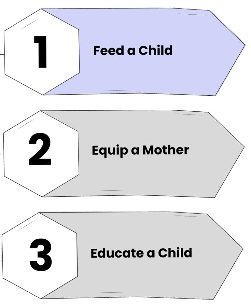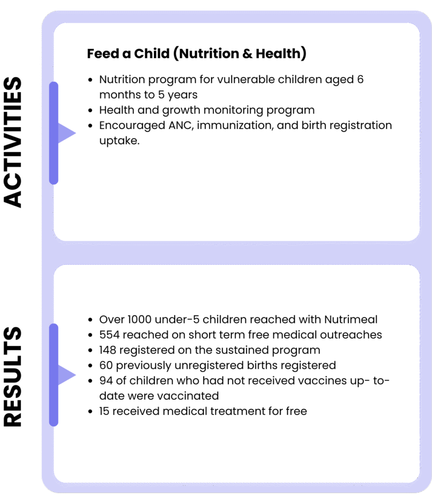 - This program is designed to meet the nutritional and health needs of vulnerable children under 5 years. The caregivers bring their children to the project center every week to pick up the ‘Nutrimeal’ (cereal made from healthy locally found ingredients for high impact nutrition) supply for the next week, growth monitoring, and routine monthly health checks.